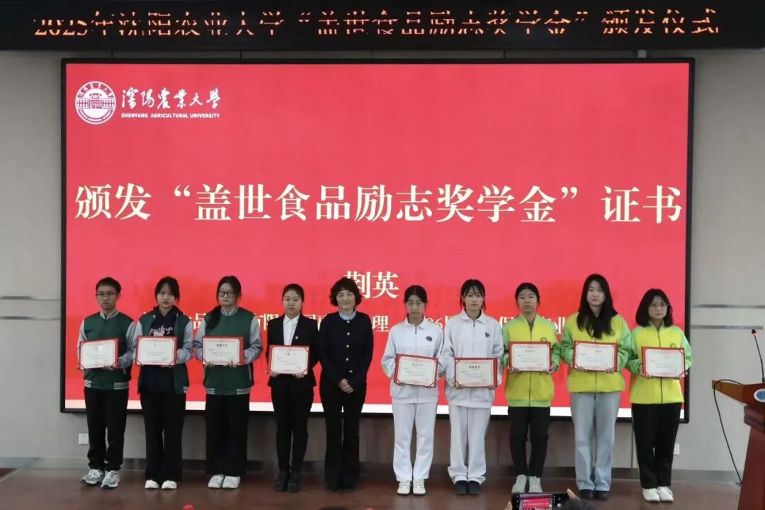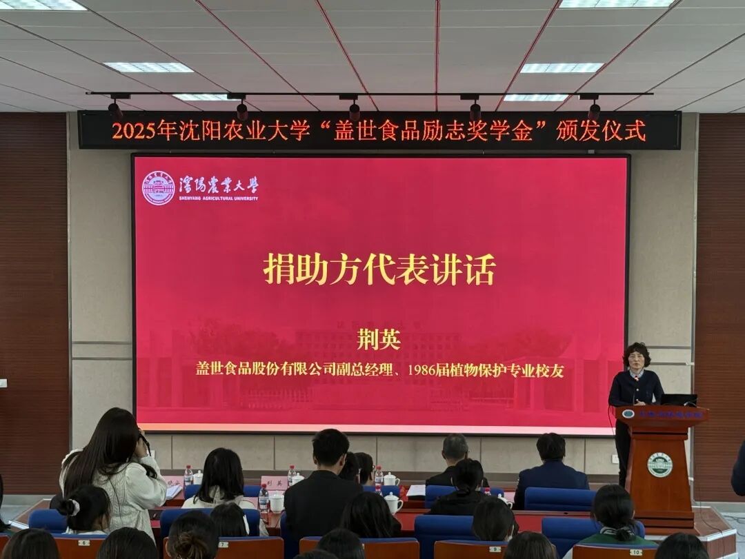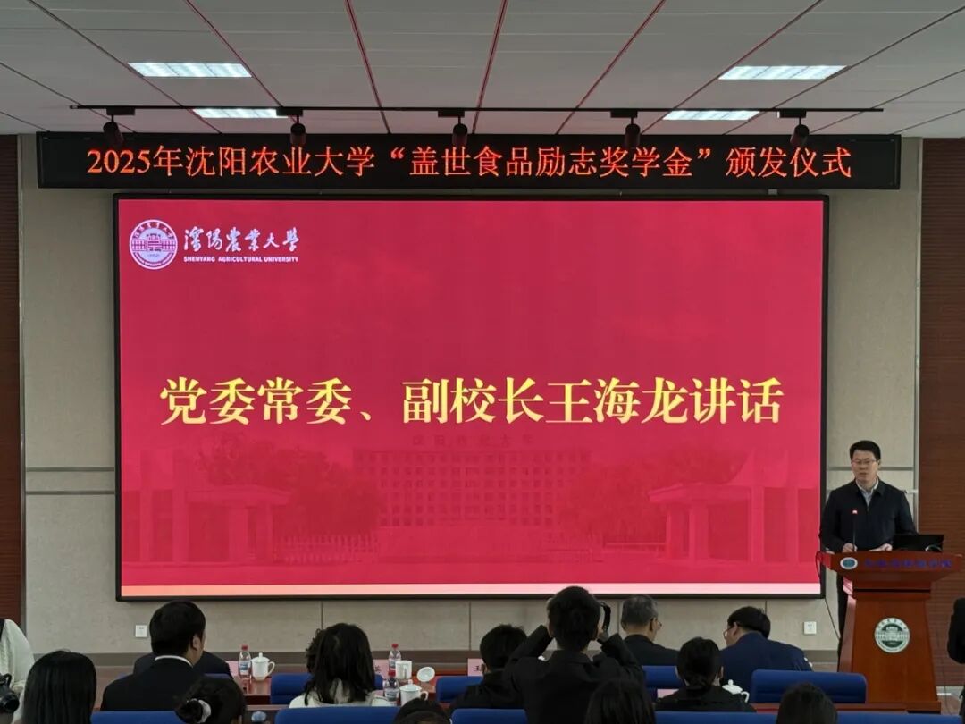为表彰先进、激励成长,10月25日上午,2025年“盖世食品励志奖学金”颁发仪式在沈阳农业大学土壤楼A座226报告厅隆重举行。盖世食品股份有限公司副总经理荆英,校党委常委、副校长王海龙,党委学生工作部(学生处)部(处)长宋德群,财务管理中心副主任李丙秋,学生处副处长蹇东伟,学生处学生资助中心负责人以及相关学院负责人、辅导员及获奖学生代表出席仪式,大会由党委学生工作部部长宋德群主持。