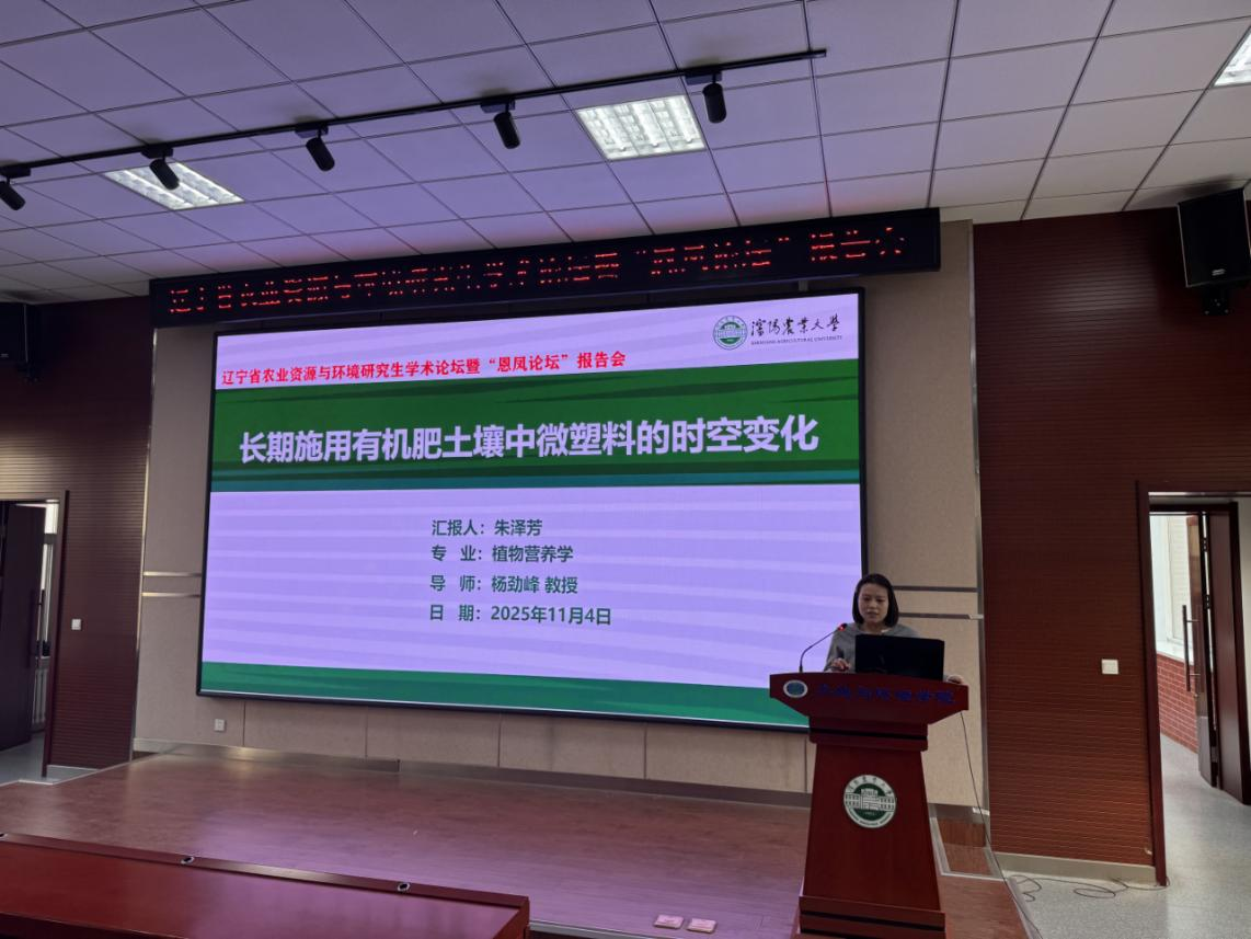 2025年11月12日,第十三期辽宁省农业资源与环境研究生学术论坛暨“恩凤论坛”报告会在土壤楼A座226报告厅成功举行。本次论坛特邀植物营养与施肥技术团队的2022级博士生朱泽芳进行学术汇报,报告题目为“长期施用有机肥土壤微塑料的时空演变”。王月老师主持本次会议。